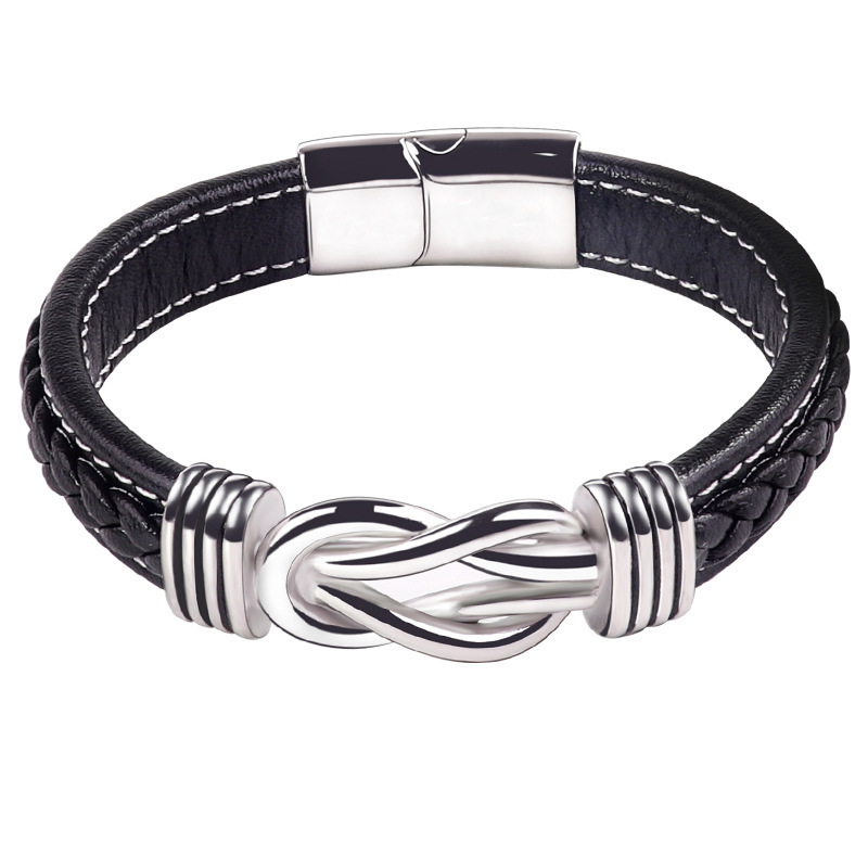 Black leather bracelet with stainless steel celtic knot and slide in clasp